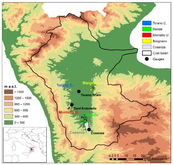 Location of the Crati River basin, of the main municipalities and of the selected gauges on a Digital Elevation Model (DEM).