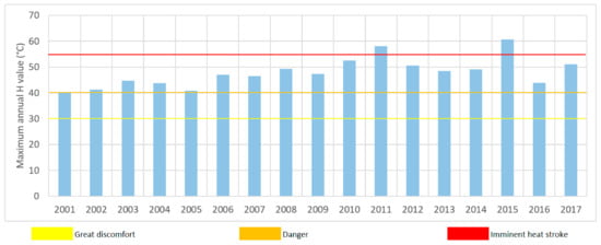 In particular, in 2011, in 2015, and in 2017 more than 150, more than 200 and about 100 time intervals showed Humidex values higher than 40, respectively. Moreover, in these years, the “Imminent Heat Stroke” threshold was exceeded, thus showing high human risks due to heat exposure.