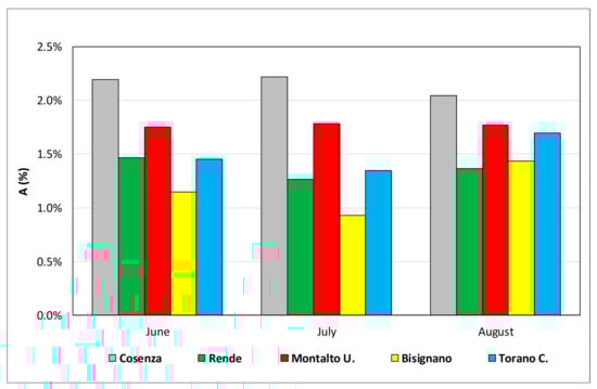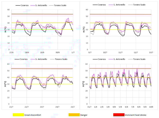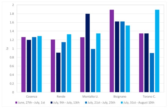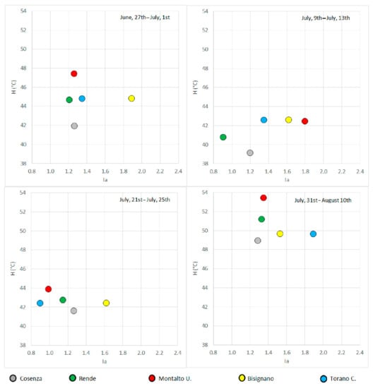 In order to perform this comparison, due to proximity and to temperature characteristics, the H values for Rende have been evaluated as an average of the H values estimated in Cosenza and Sant’Antonello, while the H values for Torano have been also used for Bisignano. Results evidenced that high Ia values have been identified in the fourth event, when the high H values (ranging between 48.9 and 53.4) have also been identified. In particular, in the fourth event the highest Ia values have been detected in the smaller municipalities (i.e., Torano C. and Bisignano) with respect to Cosenza, although with similar H values, probably because of a lower presence of air conditioning systems and a greater incidence of outdoor works. Moreover, in Bisignano in the first event, higher Ia values than in the fourth have been identified, despite the latter presented a higher Humidex. This particular behavior could be due to the traditional medieval horse tournament, the so-called “Palio”, which induces several emigrants to return in the last week of June, with a consequent large increase in the resident population.