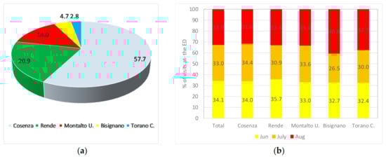 With the aim to assess the direct impact of the 2017 heatwaves on the health of the population of the Crati River valley, Emergency Department (ED) data of the Annunziata Hospital of Cosenza have been thoroughly analysed. First, in order to have an idea of the annual ED data, a total of 29,031 ED visits between January–December 2017 have been extracted (Table 3). The majority of the visits (57.7%) belong to the municipalities of Cosenza (Figure 4a), followed by Rende (20.9%) and Montalto (14.0%). Then, taking into account the higher influence of temperature than humidity on the Humidex evaluation, and considering that the study area is characterized by a Mediterranean climate, the ED data from June to August, which could be related to heat waves symptoms, have been considered in the following analyses. Figure 4b reports the access percentage in the summer months.