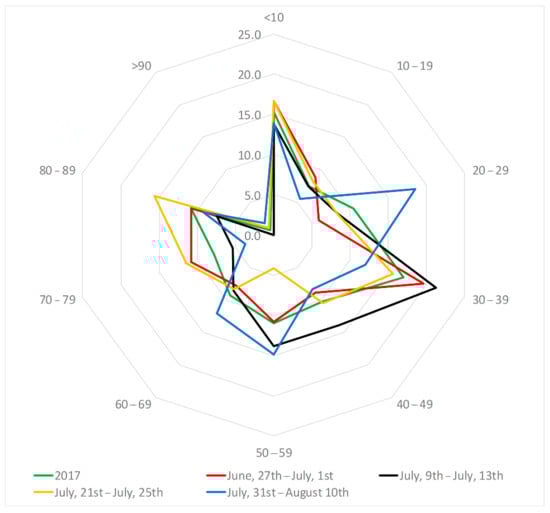 In order to detect the most exposed categories, considering age and gender, the total number of accesses to the ED during the four heat waves have been grouped in several classes. In particular, as regards age, 10 classes have been considered and the incidence of access for the different classes has been evaluated (Figure 8). For the whole summer 2017, results indicated a higher incidence of access for children in the age group up to 9 years, and for the elderly in the age group between 80–89 years, who can generally be considered the groups most at risk, but also for the group between 30–39 years. This general behavior has also been confirmed for the four events, with the exception of the last one in which a high incidence of accesses in the group between 20–29 has also been identified, probably because people in this age range are more active than the others. On the contrary, for all the events the lowest ED accesses have been identified in the group >90 years. Moreover, a low incidence of access has been identified in the third event, for the age group between 50–59 years, and in the fourth event for the age groups between 10–19 years and 70–99 years.