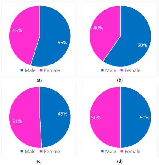 Incidence of accesses to the ED of the Annunziata Hospital of Cosenza for different sex in (a) 27 June–1 July (b) 9 July–13 July (c) 21 July–25 July (d) 31 July–10 August.