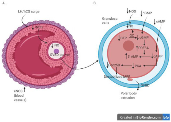 In an in vitro study using cultured rat ovaries, different roles of iNOS-induced and eNOS-induced NO after LH surge were proposed by Nakamura et al., 2002 [32]. The LH surge induces an increased expression of eNOS in the theca cell layer, favouring the blood supply to the preovulatory follicles, while iNOS expression decreases in granulosa cells, inducing the subsequent decrease of the intrafollicular NO concentration [32]. More in detail, before the LH surge, the high concentration of iNOS-induced NO induces the increase in intrafollicular cGMP and the maintenance of meiotic arrest [45]; on the contrary, the LH surge suppresses iNOS expression. The consequent drop of NO determines the decline in the level of intrafollicular cGMP. This allows the sequential activation of RAF, MAP2K1, and MAPK, with consequent disruption of gap junctional communication in the somatic follicular cells. The breakdown of gap junctional communication stops the transfer of the cAMP from the granulosa cells to oocytes, enabling the resumption of meiosis. The activation of MAPK also leads to cumulus expansion and ovulation in rat follicle-enclosed oocytes cultured in vitro [48]. The schematic view of the involvement of NO during the process of GVBD and meiotic resumption after LH surge/hCG administration is illustrated in Figure 2.