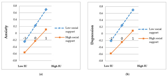 Table 5 shows the moderating effect of social support between IU and mental health outcomes, including anxiety and depression (p < 0.001). The results shed further light on the effects of IU on anxiety and depression were significantly weaker at higher levels of social support (β = 0.33 and 0.33, p < 0.001) than that at low levels of social support (β = 0.47 and 0.45, p < 0.001). Simple effects of moderation are depicted in Figure 1. The slope of low support was steeper than that of high social support in anxiety and depression. This result indicated that at a level of low social support, college students with high IU scores were associated significantly with much more anxiety and depression outcomes, which could be weakened by high social support.