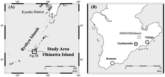 Okinawa Prefecture, located in southwestern Japan, is the only prefecture in the country with a subtropical climate (Figure 1A). Ryukyu limestone, which originates from coral reef sediments, formed approximately one million to 500,000 years ago []. Limestone is widely distributed, and there are numerous limestone caves in Okinawa. The southern part of Okinawa Island consists of the Neogene-Quaternary Shimajiri Group and the Ryukyu Group, with low-lying terrain below 200 m in elevation. The Shimajiri Group of the Neogene Pliocene is predominantly composed of mudstone and is prone to erosion, while the limestone Quaternary Pleistocene Ryukyu Group, which is predominantly composed of limestone, is more resistant to erosion and forms a flat-surfaced topography []. The Ryukyu limestone overlies the Shimajiri Group in a non-conformant way. The Ryukyu limestone is permeable, while the Shimajiri Group is impermeable []. Therefore, Ryukyu limestones serve as aquifers in Okinawa Island (i.e., Ryukyu aquifer).
