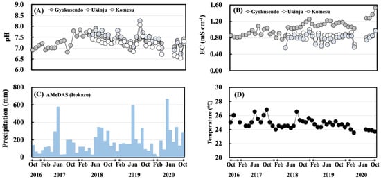 Monthly variations for the October 2016–October 2020 period of pH (A), electrical conductivity (B), and precipitation (C) in the water samples, and temperature (D) in the Gyokusendo cave.