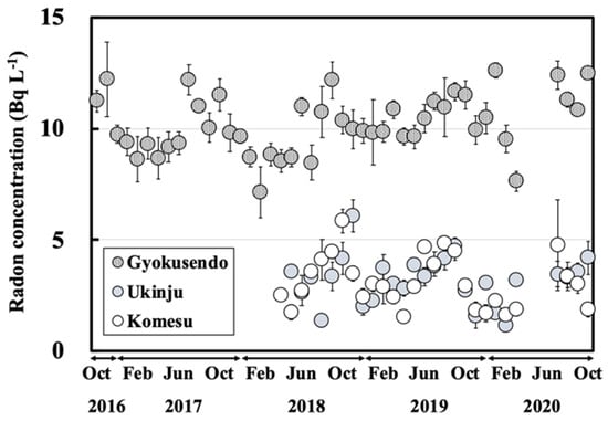 - The radon concentrations in the water samples from the Gyokusendo cave, Ukinju spring, and Komesu spring were 10 ± 1.3 Bq L−1, 3.2 ± 1.0 Bq L−1, and 3.1 ± 1.1 Bq L−1, respectively. Radon concentrations for the water samples showed a gradually increasing trend from summer to autumn and decreased in the winter. This was particularly noticeable in the radon concentrations measured in the dripping water sample from the Gyokusendo cave.