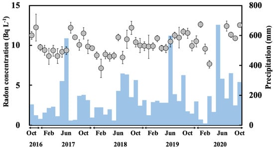 The temporal variation in the radon concentrations of the dripping water from the Gyokusendo cave and the precipitation recorded for the study period are shown in Figure 5. The monthly precipitation was approximately 500 mm during the rainy season, increased during the typhoon season, and decreased to approximately 100–150 mm during winter.
