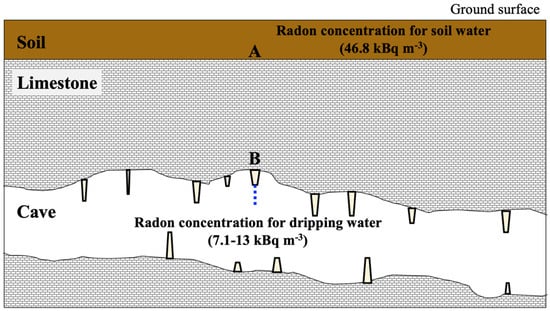A schematic of a vertical section of the Gyokusendo cave is shown in Figure 6. In the figure, A shows the boundary between the soil and the Ryukyu limestone, and B is a straw stalactite on the cave ceiling where the dripping water is collected. Precipitation percolates through the soil and limestone bodies above the cave and seeps into the cave from the ceiling as dripping water. Since radon is rarely present in precipitation, radon in groundwater is mainly supplied by the soil. The concentration of radon in water infiltrated into the ground increases with time due to the supply of radon produced by soil particles. However, as the concentration increases, the number of decaying radon atoms increases, and eventually, an equilibrium state is reached where supply and decay are equal. Therefore, radon in the soil water and 226Ra in the solid phase are in permanent equilibrium. Additionally, if radon remains in the soil long enough, the concentration of radon in the gas and liquid phases will reach the equilibrium state specific to each soil species. The following equations were used to quantify the radon concentration in soil water and the gas phase at gas-liquid equilibrium: