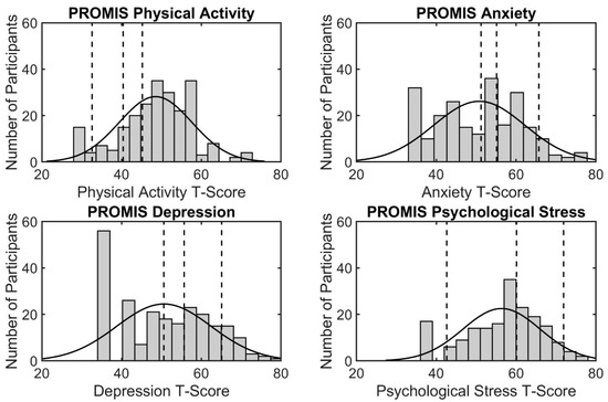 Distribution of T-scores for each of the four PROMIS measures. For each figure, the X axis represents PROMIS standardized T-score and the X-axis represents the number of participants. The vertical dashed lines depict the cut-points for each category (normal, mild, moderate, severe (physical activity, anxiety, depression) or low, average, high, very high (psychological stress)).