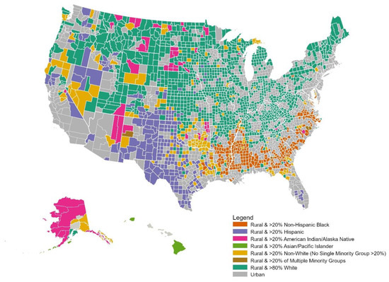 The intersection of rurality and minority race/ethnicity in the United States is critical to our understanding of health disparities broadly, and cancer disparities specifically, but is often overlooked [24,25,26,27]. Overall, one in every 25 people in the U.S. is a non-White rural person (i.e., 22% of the U.S. rural population) [28]. Although most rural persons are White, 9% and 8% belong are Hispanic and Black, respectively. Rural, non-Hispanic Black and Hispanic populations reside primarily in the South (Figure 1), whereas rural American Indian/Alaska Native populations primarily reside in Alaska, the northern plains, and the Southwest. Although rural populations overall have declined because of outmigration and urban sprawl, rural Hispanic populations have grown in recent decades [29]. Furthermore, there are many counties throughout the country in which notable proportions of the populations are non-White (i.e., smaller proportions of racial/ethnic minority populations combine for a notable proportion of the total population). The intersection of the aforementioned structural barriers experienced by rural and racial/ethnic minority populations will be the focus of this paper. We begin our review by describing structural and contextual factors that disproportionately affect rural racial/ethnic minority populations and contribute to cancer disparities. Next, we summarize the literature from the past 20 years on disparities experienced by rural, racial/ethnic minority populations across the cancer control continuum. Finally, we discuss the opportunities for observational and interventional research to mitigate these disparities.
