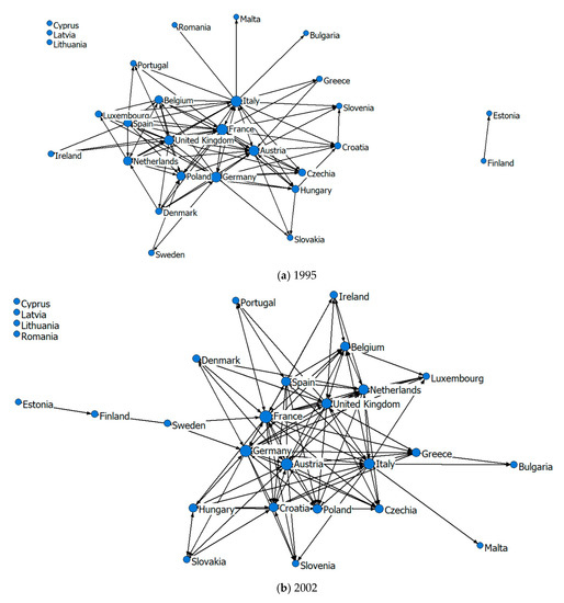 (4) The out-degree values of Germany, Italy, France, the United Kingdom and Spain are larger than their in-degree values, showing that the radiation impact of these five countries on other countries is greater than the radiation impact of other countries on them, and the five countries are more active in the core position of the tourism economic network. The in-degree values of Austria and Croatia are larger than their out-degree values, indicating that the radiation impact of other countries on these two countries is greater than their radiation impact on surrounding countries. The in-degree values of Poland are far larger than its out-degree values in 1995, 2002 and 2009 but almost the same in 2018, which led to a significant increase in the degree centrality of Poland.