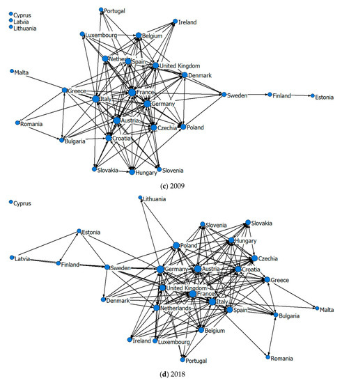 (2) The out-degree analysis shows that the out-degree values of Germany, Italy, France, the United Kingdom, Spain, and Austria are large. These six countries are in the first camp, with a steady growth trend, showing that their status in the EU tourism economic network was continuously being consolidated, they had closer ties with other countries, and their tourism economic radiation capacity was growing increasingly prominent. The out-degree values of the Netherlands, Poland, the Czech Republic, Hungary, Croatia, Greece and Sweden are higher than the average (in 2018) and are in the second camp, showing rapid growth. Their tourism economic ties with other countries were gradually strengthened, and their radiation capacity was greatly improved. The out-degree values of Cyprus, Latvia, Lithuania and Malta are 0, indicating that the driving effect of these four countries on other countries was extremely weak, and they were relatively far from other countries in the EU.