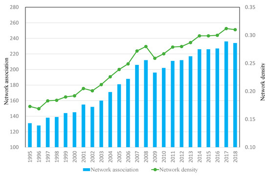 The higher the network density, the stronger the connection between nodes, and the more ways there are to achieve contact from other nodes, which is conducive to the development of each node. Figure 2 shows the evolution trend of spatial association and network density of the tourism economy in the 28 EU member states from 1995 to 2018. Spatial association increased annually, with the number increasing from 131 to 234. The complete network density also increased annually, from 0.17 to 0.31, indicating that tourism economic ties between EU member states were growing increasingly close. At the same time, 2008 can be seen as a cutoff point, as after 2008 the international economic crisis had a negative impact on tourism economic ties among EU member states.