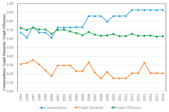 The EU tourism economic network is measured by three indicators: connectedness, graph hierarchy and graph efficiency. Figure 3 shows that, from 1995 to 2018, connectedness n increased from 0.67 to 0.93, indicating that EU tourism economic ties were gradually growing closer, and there were very obvious spatial association and spillover effects. Graph hierarchy declined from 0.31 to 0.21, and the hierarchy of the spatial association structure was weak. The mutual connection and mutual influence of the tourism economy gradually strengthened. Graph efficiency showed an annual downward trend, from 0.72 to 0.63, indicating that the number of connections in the tourism economic spatial association network increased, and the stability of the network improved. From the measurement results of the three indicators, it can be seen that, with the development of the marketization process, the hierarchy system of the tourism economy weakened, spatial association increased, and the stability of the network was enhanced.