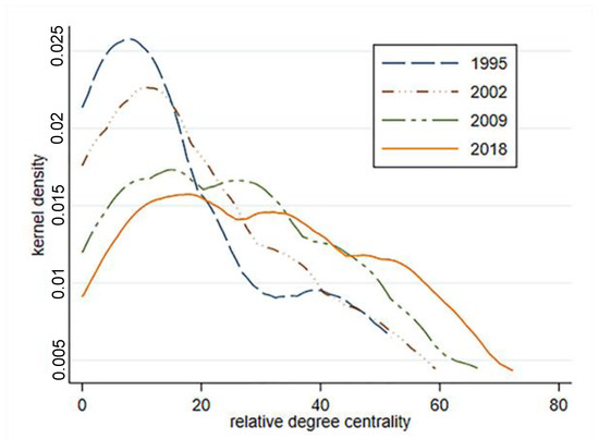 In Figure 4, the estimation results of the relative degree centrality kernel density of the EU tourism economic connection network from 1995 to 2018 show that the relative degree centrality kernel density estimation maps of the four periods are all right biased, indicating that the number of countries with more tourism economic ties is relatively small. The peak is getting lower and the right tail is getting longer, which reflects that the proportion of countries with fewer tourism economic ties is gradually decreasing, the overall distribution is shifting to the right, the number of countries with more tourism economic ties is increasing, and tourism economic ties are becoming closer.