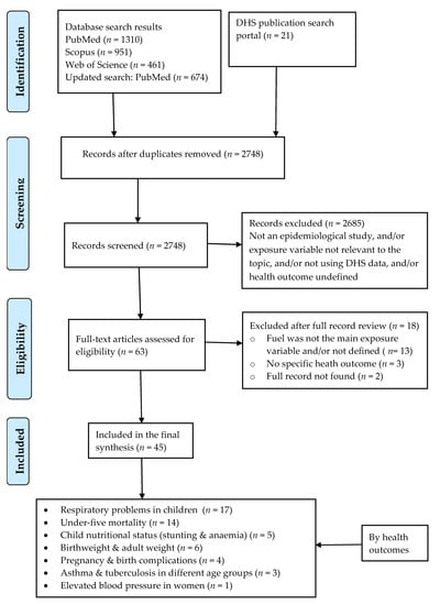 The PRISMA flow chart is shown in Figure 1. The main database search returned 3396 records, plus 21 studies obtained from the DHS publication search portal. Of the 2748 records left after the removal of duplicates, 63 full-text records were downloaded for further assessment. The remaining 2685 records were excluded because they were not relevant to our review (see Figure 1 for details). Of the full-text records reviewed, 45 (71%) studies met our inclusion criteria (Figure 1). Table 1, Table 2, Table 3, Table 4, Table 5 and Table 6 contain a detailed summary of the included studies, including year, country, health outcomes, statistical methods, sample size, among others.