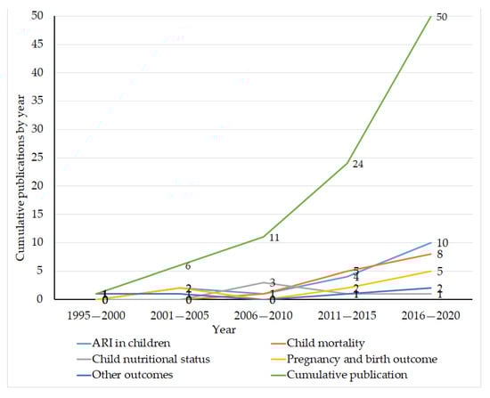 The included studies were published between 1999 and 2020, with the majority covering the period 2013–2020. The DHS data used by these studies were collected between 1992 and 2018. ARI in children is the most frequently reported health outcome (17 studies) followed by the studies of under-five mortality (including neonatal, post-neonatal, infant and child) (14 studies). Figure 2 presents a summary of the included studies by the number of publications, types of health outcomes and year of publication (Figure 2).