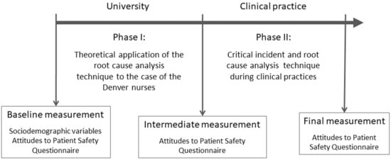 The educational intervention was based on RCA and critical incident techniques and was carried out in two phases, developing in the same way in the two academic years considered (Figure 1). Phase I was carried out in the classroom by the teacher responsible for the subject and a member of the research team. The duration was 120 min. With no prior structured knowledge about patient safety, groups of five students applied the RCA technique in a real case related to errors in the administration of medication known as “The case of the Denver nurses” [35]. This case is based on real events and deals with the chain of human errors and system failures that occurred from the admission of a pregnant woman to the death of the baby due to an error in the administration of medication. The exercise was based on teaching materials on patient safety prepared by the Spanish Ministry of Health, Social Services and Equality [36]. In addition, the exercise included a series of questions to delve into the basic principles related to patient safety (e.g., whose fault was it?). The case was resolved and a guided reflection was carried out on the basic principles of patient safety.