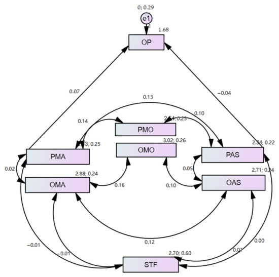 The estimations established in the trajectory analysis had significant values, with a positive and significant bidirectional influence (Table 6): between PMA and PAS; between PMA and OMA; between PAS and OAS; between OMA and OAS; between PMO and PMA; between PMO and PAS; between OMA and OMO; and between OAS and OMO. There was also a positive and significant influence between PMA and OP and a negative and significant influence between PAS and OP.