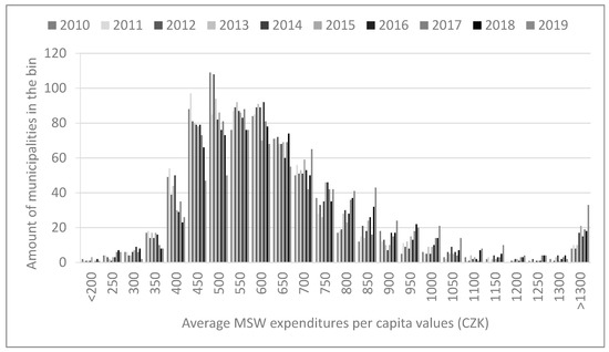 Figure 1 shows a histogram of per capita current expenditures on MSWM for the municipalities in the analyzed group with values for each of the 10 included periods. The histogram shows the occurrence frequency of certain values or a range of values within a sample. This provides a comprehensive picture of what the most common values are in the sample. As several municipalities occasionally reported relatively high values compared to the majority of the group, in order to preserve the legibility of the histogram, these municipalities are reported together in the category “over 1300”.