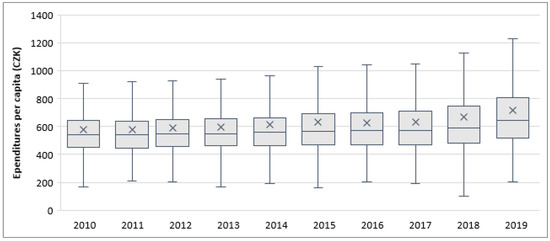 Figure 2 shows boxplots of per capita WM expenditures in the analyzed group of municipalities for individual years within the analyzed period. In addition to the information from Table 2, we can see that the median values were relatively stable until 2017 (ranging within CZK 540–570 per capita) and only then began to increase more. The standard deviation of per capita expenditures for the period was 317 (ranging within 250–400 for individual years), while the mean value was 623 (ranging within 600–700). Together, these result in the coefficient of variation being 0.51 (ranging within 0.45–0.55), which means that the variation in the observed data can be considered low. This was to be expected, as MSWM represents a relatively unified service and, with WM companies competing among them, in general there should not be very large differences among the relative expenditures of individual municipalities unless some specific conditions are present.