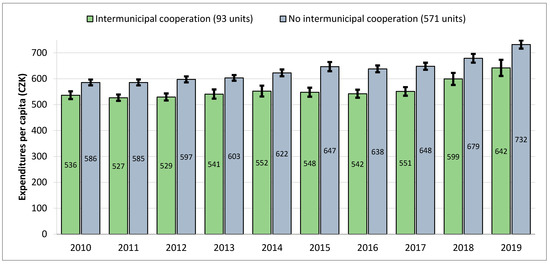 For the subsequent analysis of the expenditures, we used two methods. The first is a statistical analysis consisting of comparing the calculated per capita expenditures in individual years and differentiating between municipalities participating in IMC focused on WM and municipalities that did not participate in any kind of IMC focused on this field (although these municipalities may have participated in IMCs focused on other areas). When larger samples are used, such as in our case, calculating these values provides very clear and straightforward information about the development of the variables and can be directly and easily interpreted in terms of probable effects from IMC on the results.