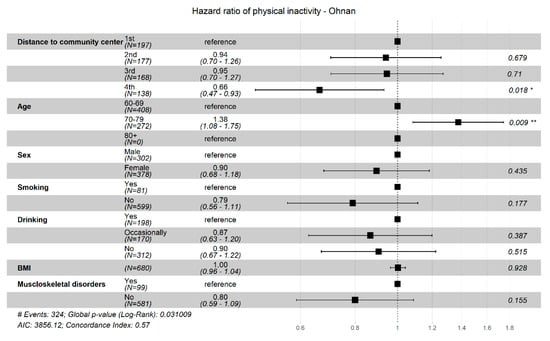 While other survival analysis methods, such as random survival forest, could also be applied to our data, we chose Cox proportional hazards models in order to be consistent with previous studies investigating other health-related outcomes [,,]. Although, for example, random survival forest may have advantages when handling complex and high-dimensional data [], it has not yet been confirmed whether it is superior to Cox proportional hazards models for all types of health outcomes, such as cancer or cardiovascular disease incidence [,,]. In this study, we selected five neighborhood environmental variables based on previous neighborhood research and applied Cox models for the ease of consistent interpretation of our results with previous studies [,,,,]. Considering different features of the residential municipalities, we performed subgroup analysis by each residential municipality. Finally, considering a natural aging effect of the study subjects, i.e., older adults tend to become more inactive as they age, subgroup analysis by age group (in addition to residential municipality) was conducted (Supplementary Table S2). Cut off for the age was set at 75 years as this is the age when the medical insurance system switches to the Medical Insurance System for the Latter-Stage Elderly in Japan, and it was also found to represent a point when elderly people decline in their activity and functional levels [,,,]. All statistical analyses were conducted using R 3.6.1.