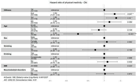 In Okinoshima town, where fishing is the main industry, the residents who lived in hilly areas had higher risk of physical inactivity. This result is inconsistent with a previous cross-sectional study that found that living in a hilly neighborhood was positively associated with PA among older Japanese adults []. The positive association between hilliness and PA was hypothesized to be due to beautiful scenery in a hilly environment encouraging older people to conduct recreational PA. In a previous study, hiking trails in hilly environments were reported to encourage PA among the residents of rural areas []. On the other hand, it was reported that uphill walking has a higher perceived exertion and physical load []. In addition, hilliness has been reported as a risk factor for weight gain, and it has been associated with lower recreational PA (sports) among older adults [,]. It is therefore inconclusive whether hilliness could be a barrier or promoting factor for PA and health as the perception of hilliness might differ between individuals. Older people who have lived and worked in a hilly environment during their life may be less likely to perceive such terrain as a barrier []. Furthermore, given that some previous studies have found that hilliness is a health-promoting factor, i.e., hilly neighborhoods had a preventing effect for type 2 diabetes, it is important to investigate its effect by assessing whether there is a clinically meaningful cut off for the degree of hilliness (slope) [].