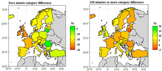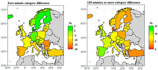 The category of at least 150 min includes respondents who spend 150 min or more a week on health-enhancing physical exercises. In this category, no negative difference was observable, which implies that there was no European country with a higher share of women. In Denmark, Turkey, Finland, Iceland, and Poland, the gap remained in general between +2.2 and 3.9%. Some countries like Portugal, the Czech Republic, or Austria reported a difference over 8%, while France, Slovakia, the United Kingdom, and Luxembourg presented a 9% gap. The biggest difference was seen in Spain (+11.4%), Slovenia (+10.6%), and Ireland (+10.1%), with men’s higher share. This was quite close to the EU-28 mean, which was 8.1% in 2014. These data demonstrate altogether that women in general were more likely not to take part in any health-enhancing, not work-related physical activity. This was especially true for southern EU countries, and more to the north we looked, the more this tendency declined; in the northern EU, this trend was reversed. In the category of at least 150 min a week, there was no such obvious geographical difference, and the data distribution was not so significant either—this means there was no significant gender gap. Nevertheless, wherever there was a gap, it was men who had a higher share.