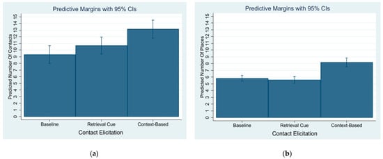 On average, the baseline approach elicited 9.28 contacts (SD = 8.69), the retrieval cue elicited 10.61 (SD = 7.68), and the context-approach elicited 13.13 (SD = 7.60). The number of places visited was lower. On average, the baseline approach elicited 5.72 places (SD = 2.30), the retrieval cue elicited 5.67 (SD = 3.08), and the context-approach elicited 8.27 (SD = 4.01).
