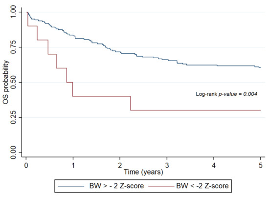 Probability of overall survival for patients with pediatric hematologic malignancies determined by body weight Z-score at diagnosis. OS: overall survival, BW: body weight.