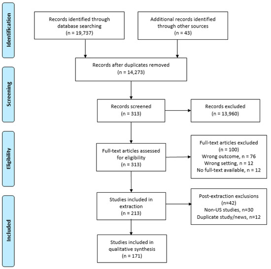 A total of 213 records were eligible for extraction. The extraction form collected information about the strategies addressed, barriers, motivation, and reported outcomes, as open fields, extracted directly from the source and then coded with codes developed a priori, based on insights gained via the screening process [19]. New codes were added as needed. The codes for strategies were developed based on previous research concerning healthful consumer environments in restaurants [20,21]. The extraction form was tested and revised with the research team before full implementation. Upon the completion of the extractions, each record was reviewed by a second reviewer for completion and accuracy, followed by a final check by the lead investigator. Conflicts encountered during the screening, extraction, and quality check were resolved during weekly team meetings. Prior to analysis, data cleaning procedures included revising codes and eliminating records that provided duplicate information, such as media articles discussing the same news or multiple intervention studies examining the same intervention. The records were compared, and the complete record was kept, adding information from the other record(s) as needed [22]. As a final step, we excluded sources that discussed strategies implemented outside of the United States (n = 30) to have a more uniform national context for the review. The screening and review process (Figure 1) resulted in a total of 171 records for analysis.