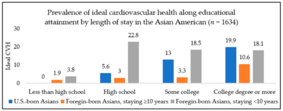 Differences in the association between education and cardiovascular health by the length of stay in the U.S. were not consistent in our study population. Although the odds of ideal CVH showed an educational gradient for both foreign and U.S.-born Asian Americans, the odds of having ideal CVH was substantially lower for those in low vs. high education among the foreign-born living in the U.S. more than 10 years. However, for both groups, results became non-significant after adjusting for confounders. A number of prior studies have shown that foreign-born Asian Americans who reported living in the United States for more than 10 years were more likely to have CVH problems (e.g., hypertension, diabetes, obesity) than recent immigrants [7,57]. However, some studies have found no significant difference by the length of stay after adjusting for demographic and health characteristics or have shown that cardiovascular risk factors are lower among those living in the United States >10 years [6,58,59]. These findings demonstrate the heterogeneity and complexity of this relationship and demand data and research on specific aspects of acculturation proxies (the language spoken at home, age since migration, cultural belief, and access to care) in future research.