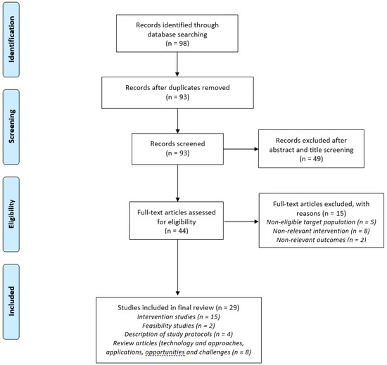 Ninety-eight reports were retrieved from the literature review. The 98 reports yielded 29 eligible articles. Reports’ exclusion was mainly attributed to non-relevant interventions (e.g., home-based computerized training, supervised outpatient programs, and virtual reality interventions), non-eligible target population (e.g., adults), and duplicate reports. The included reports mainly consisted of telerehabilitation-related intervention studies in various pediatric populations (e.g., children with chronic diseases and physical disabilities) and review articles on pediatric telerehabilitation (e.g., technology and approaches, applications, and opportunities and challenges; Figure 1). From the literature review it was clear that telemedicine and telehealth solutions are emerging rapidly in health care; however, the identified publications used different kinds of technological solutions, addressed different populations (e.g., cystic fibrosis, cardiac conditions, obesity, etc.) with limited reference to moderate–severe physical limitations, and there was no agreement on guidelines for the use of telerehabilitation in pediatrics. Finally, none of the identified literature addressed telerehabilitation usage under extreme conditions of lockdown due to a pandemic.