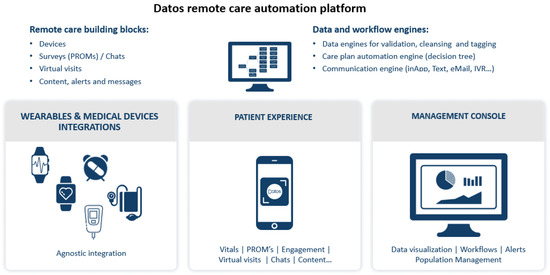 Description of Datos remote care automation platform used in the current study. In the pediatric rehabilitation department during the pandemic, and in order to facilitate connectivity, only the virtual video call functionality was used (no wearables/other medical devices were integrated).