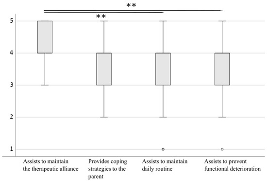 Adherence to pre-defined goals for telerehabilitation. Results demonstrated that the ability to maintain the therapeutic alliance was superior to the ability to assist in maintaining routine and to prevent functional deterioration, and marginally superior to the ability to provide coping strategies to the parent. ** p < 0.01.