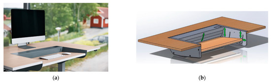 DynaDesk has a rectangular moving tray on which the keyboard and mouse are placed as shown in Figure 1a. The tray moves continuously in a slow dynamic pattern–downwards, forwards, slightly tilting, and then back again to the starting point, see Figure 1b. The continuous movement is soft, and the flow rate can be adjusted individually. In the standard version which has been used in this study, the moving DynaDesk keyboard tray is centered along the side of the desk and designed as a rectangular cut-out in the work surface. The keyboard tray is approximately 75 cm wide and 35 cm deep. On each side of the DynaDesk tray is the ordinary fixed work surface of the desk. In addition to the perpetual movement of the keyboard tray along a forward and downward slope, it was observed by surface electromyographical analyses that forward tilting of the tray was necessary to neutralize an observed increased muscular activity in the extensor carpi muscles when the tray remained horizontal during the work process. DynaDesk is patented [20].