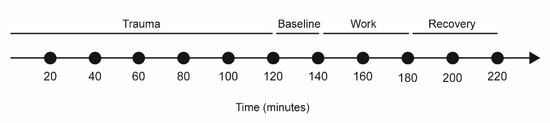 Immediately after the insertion of catheters, participants rested comfortably in an armchair for 120 min (i.e., the trauma period) to allow the tissue to recover from possible changes in the interstitial environment induced. The response to implantation of a microdialysis catheter can broadly be classified as; trauma caused by guide needle or catheter insertion [38]. Groth et al. [39] have suggested that an equilibration period of 90–120 min is required after catheter insertion in human skin. The trauma period of 120 min has been used in microdialysis experiment in trapezius muscle in human [40]. After the trauma period, participants continued to rest for 20 min, the baseline period (denoted 140 min) [19,40]. The baseline period was followed by a 40-min period of computer working. The work assignment consisted of writing a standardized text during the 40 min. The experiment ended with a recovery period of 40 min during which participants rested in the armchair, a schematic illustration of the time periods is shown in Figure 2.