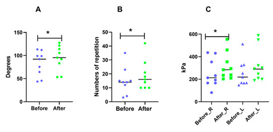 There was significant improvement (p < 0.05) for neck and shoulder strength (Figure 4A,B) after DCW. The pain sensitivity was significantly decreased in the dominant trapezius, the same trend was observed for the left side but did not reached statistical significance (Figure 4C).