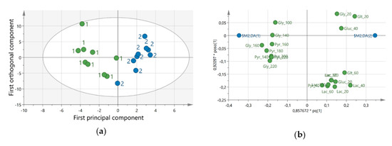 Multivariate data analysis of the metabolite. (a) represents the score plot of the orthogonal partial least square discriminant analysis (OPLS-DA) showing a clear separation between samples from before (green circles) dynamic computer working (DCW) and after (blue circles) 4-weeks DCW using DynaDesk. (b) illustrates the loading plot for the OPLS-DA model showing the substances (Gly = glycerol, Glt = glutamate, Pyr = pyruvate, Lac = lactate, Gluc = glucose) that are important for the separation between the groups. The substances are listed in Supplementary Table S1.