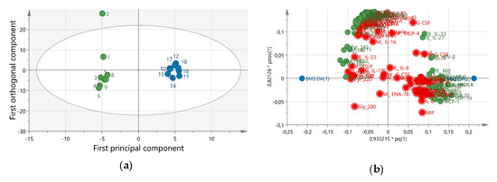Score plot of the orthogonal partial least square discriminant analysis (OPLS-DA) model (a) and loading plot (b) for all data. The score plot shows a clear separation between samples dynamic computer working (DCW) (green circle) and after 4-weeks DCW (blue circle). The loading plot represents the substances that contribute to the separation between the groups. The important variables with variable of importance (VIP) > 1 are marked green. Red marked variables have a VIP < 1 and is regarded as non-significant analytes.