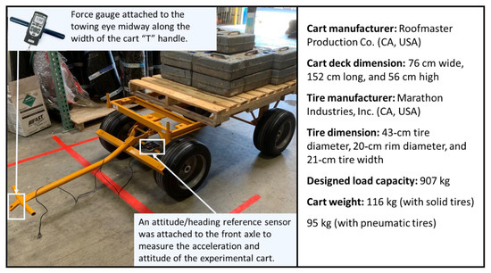 Individual differences are a known factor in OPP [23,32,33,34,35]. We controlled for individual factors by using a single subject. A male graduate student, aged 29 years, with a stature of 177 cm and a body mass of 88 kg, participated in the experiment. The anthropometric characteristics of the subject are representative of construction workers in the greater Seattle metropolitan area, based on a regional worker-profile survey [36]. The subject is healthy and free from any musculoskeletal problems. The subject visited five roofing jobsites to videotape and learn how workers operated carts. Then, he received 30 min of training on pulling techniques from two experienced workers and was given observational feedback in practice trials to ensure that identical pulling techniques were applied.