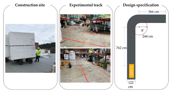 An L-shaped track (Figure 2) was constructed to represent the common working conditions for cart operations. The track allows dynamic pulling activities in both straight-line (762 cm long) and turning motions (244-cm diameter). Tapes were used to mark a 122-cm-wide lane for cart operation.