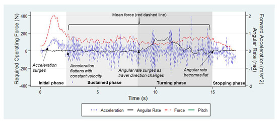 The cart movement on the L-shaped track was divided into four phases: initial, sustained, turning, and stopping (Figure 3). The four motion phases were determined post hoc using forward-acceleration and angular-rate data collected by the attitude/heading reference sensor. The “Segmented” package in the R project [39] was employed to detect the breakpoints where the linear relations between the acceleration/angular rate and time changed (Figure 3). The mean force over the sustained and turning phases, which constituted the majority of the cart movement, was obtained as the primary outcome measure of the ROF for statistical analysis. The required operating time (ROT) to finish the course of motion on the track was recorded as a measure of productivity.