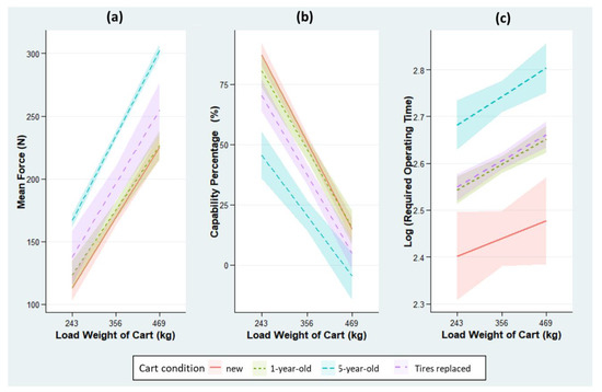 According to Table 2, both the cart condition and load are significantly associated with the ROF and corresponding CP, in most cases. A difference of 65.5 N in ROF (30.6% in CP) was found between the new and five-year-old carts, despite no significant difference between the new and one-year-old carts. Replacing the old tires on the five-year-old carts was effective in lowering the ROF (additional forces decrease from 65.5 to 27.1 N) with a moderate margin in CP (from −30.6% to −13.4%). In addition, the ROF increased as a cart was more heavily loaded, with an incremental increase of 0.487 N for every 1 kg increase in cart load, on average, for carts of different conditions.
