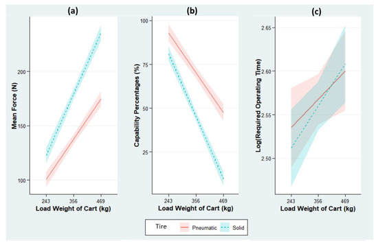 At this baseline cart load (243 kg), solid tires are estimated to require 22.0 N more force than the pneumatic tires, which is equivalent to an 11.9% decrease in CP. As the carts are more heavily loaded, however, the increase in ROF and decrease in CP become more rapid among carts with solid tires (Figure 5a,b). With every 1-kg load added to a cart, the ROT is estimated to increase 0.326 N (−0.201% in CP) for pneumatic tires, while solid tires require an additional 0.173 N of force and impose a 0.115% extra risk (i.e., −0.115% in CP) over pneumatic tires. Finally, Table 3 shows that the productivity of the cart operation is not significantly associated with the tire type (p-value = 0.645).