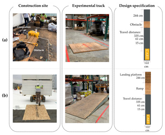 Two laboratory tracks were created by the authors and two roofers to simulate the actual physical environments on construction sites. First, an obstacle track (Figure 6a) was arranged by mounting a 122 cm × 122 cm plywood board using anti-slip traction tape. The plywood boards came in three heights: 1.9, 3.8, and 5.7 cm. Second, a ramp track (Figure 6b) was built with two 244 cm × 122 cm plywood boards attached to insulation boards. The ramp came in three slope gradients: 4°, 8°, and 12°.