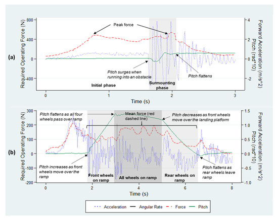 The cart movement on the obstacle track was divided into initial and surmounting phases (Figure 7a). The two phases were determined post hoc using pitch data, which denote the angle between the longitudinal axis of the cart and the horizon. As surmounting an obstacle requires impulsive forces, the peak force during the initial and surmounting phases was recorded as the ROF. The duration of the initial and surmounting phases was collected as the ROT.