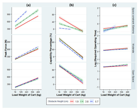 In contrast, the adverse effect of the obstacle height on the ROF was not significantly stronger in a moderately constrained space than in an open space (p-value = 0.569), while a significant but minimal gap in CP (−3.77%) was found. Furthermore, the effect of the space constraint was found to differ under different levels of cart load. As the carts were more heavily loaded, the changes in ROF/CP became more rapid in a constrained space (Figure 8a,b). For every 1-kg increase in cart load, the moderate and extreme space constraints required an extra 0.386 N of force (−0.028% in CP) and 0.845 N of force (0.072% in CP), respectively, when compared to an open space.